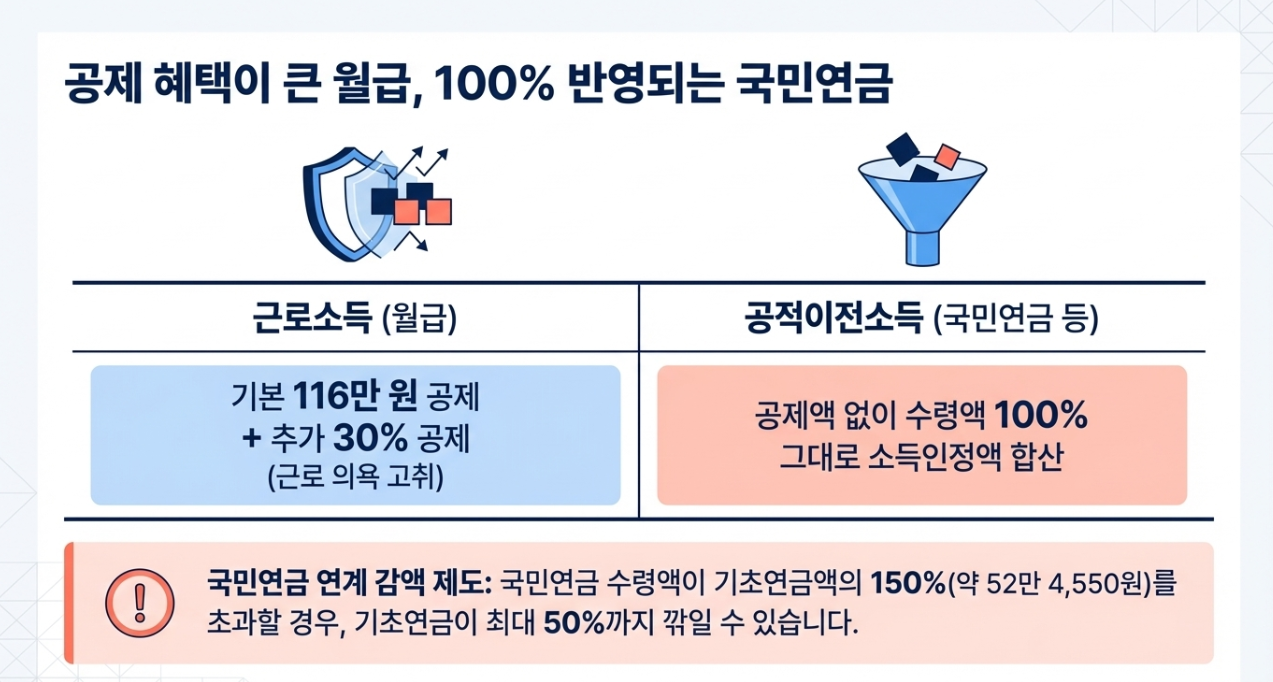 - 연금의 역설: 국민연금 수령액은 공제 없이 100% 소득인정액에 합산됩니다.